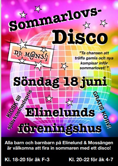 Sommarlovsdisco söndag 18 juni 19 maj, 2023Elinelundssommarstad Alla barn och barnbarn från ELMO (Elinelund-Mossängen) är välkomna! Gilla Laddar in …